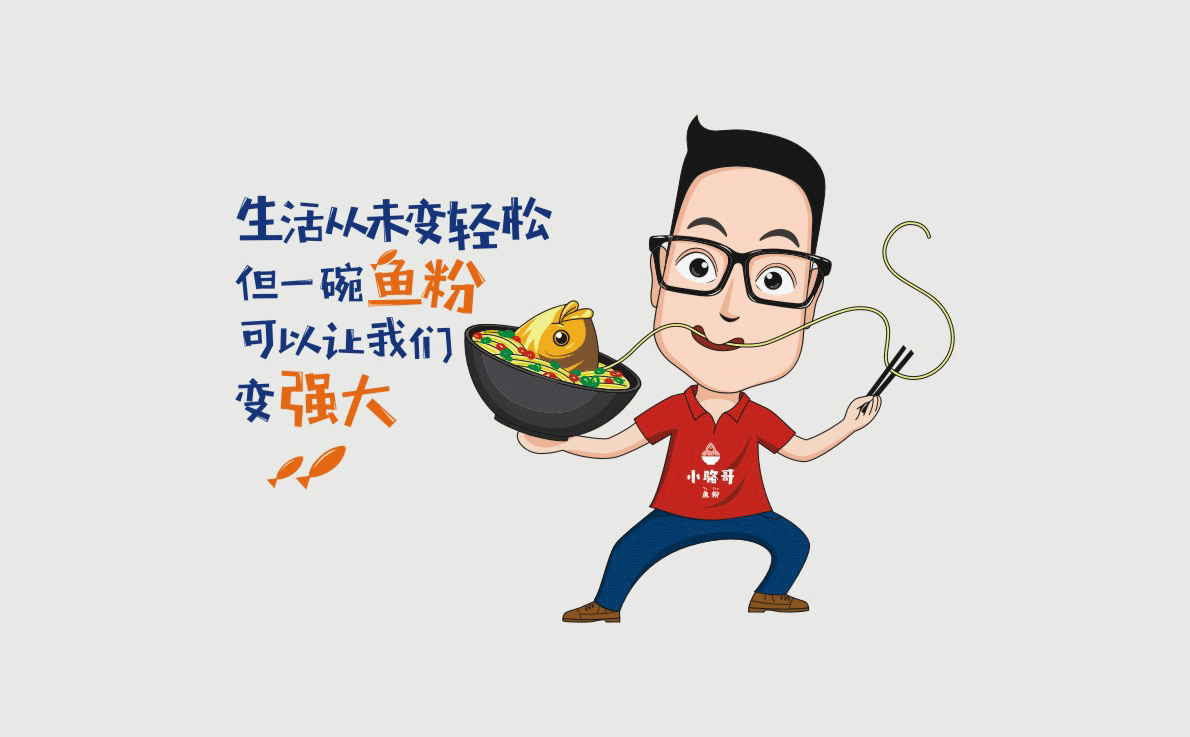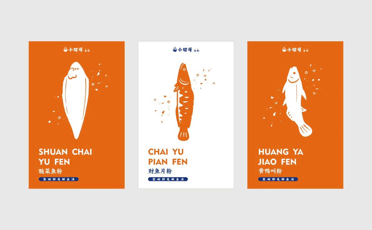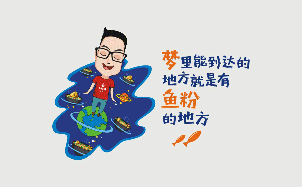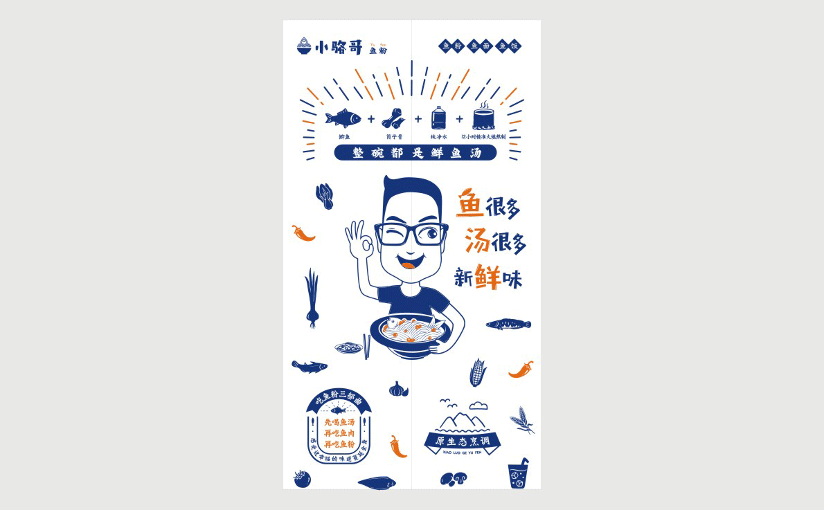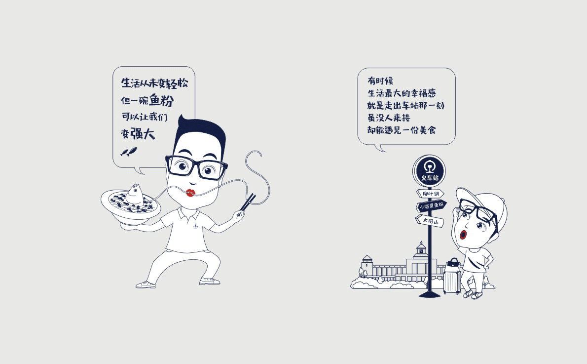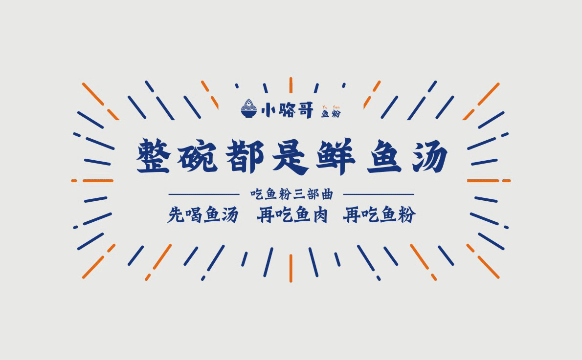 這是2018年中世銳意設計接受委托的一個小型輕食餐飲項目,委托人已經在當地成功運營了另一個知名度頗高的簡餐品牌——“挑香小面”,這一次重新建立全新品牌,是想拓展餐飲管理公司的產品范圍,并建立更加時尚的輕食品牌。小駱哥魚粉從命名開始,就自帶了濃濃的人情味,用小駱哥本人的昵稱作為品牌名,也展現了委托人對自己產品的自信。人情味與自信結合、美味與趣味融合,是我們對這個品牌最基本的創作思路。中世銳意設計以小駱哥本人為基本原型創作了系列卡通人物插畫;我們創作了系列關注年輕人學習、生活中內心波瀾的小段子;我們在空間設計中嵌入魚元素的造型,讓小魚空間中游弋,使其成為品牌的超級符號;我們用原生態實木設計的戶外招牌,展現了濃濃的人情味; 獲得第13屆“創意中國”設計大獎賽全國金獎。