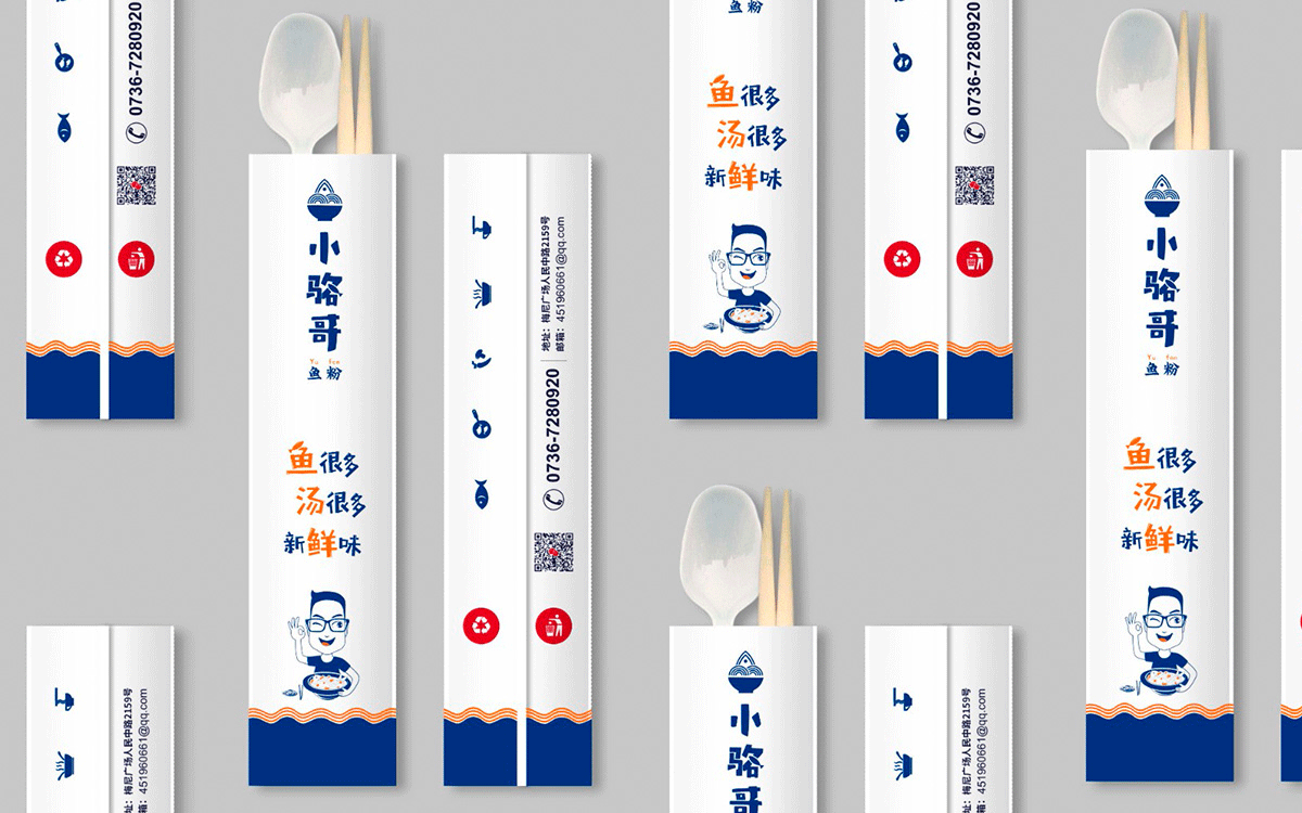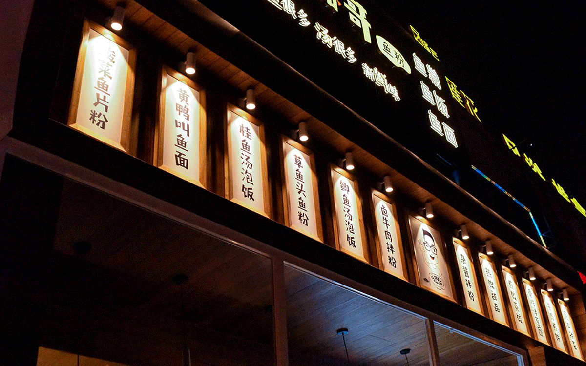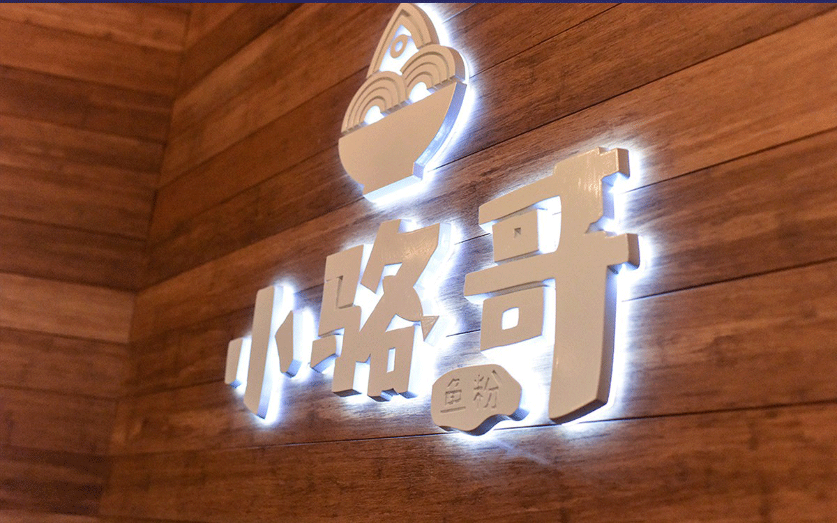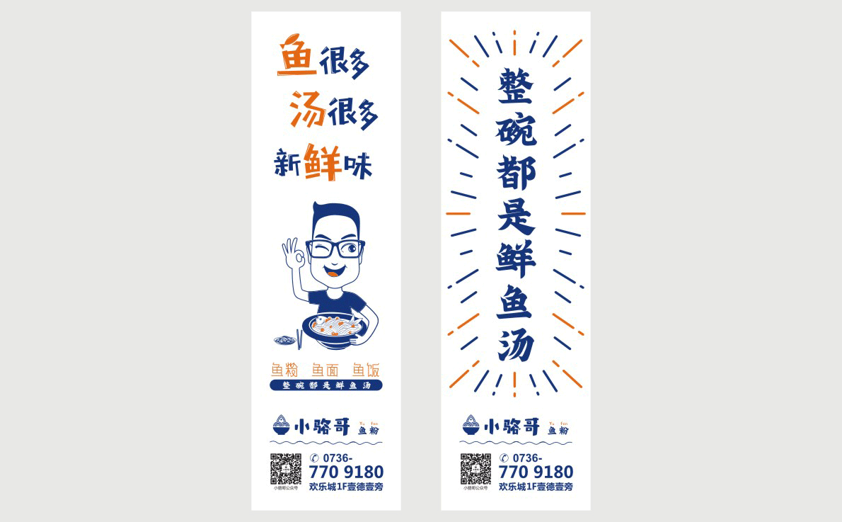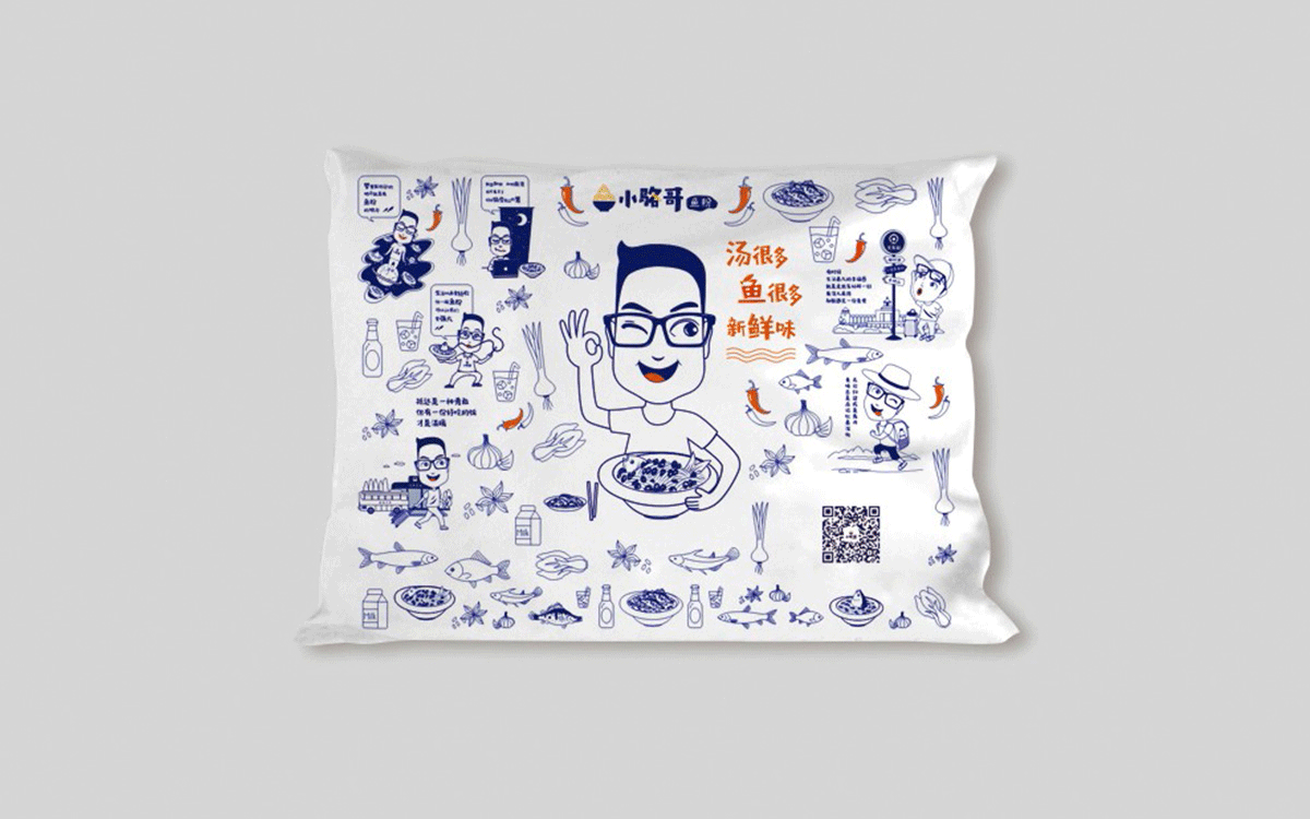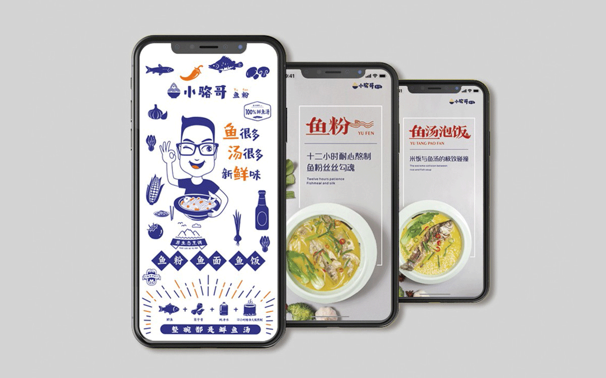 這是2018年中世銳意設計接受委托的一個小型輕食餐飲項目,委托人已經在當地成功運營了另一個知名度頗高的簡餐品牌——“挑香小面”,這一次重新建立全新品牌,是想拓展餐飲管理公司的產品范圍,并建立更加時尚的輕食品牌。小駱哥魚粉從命名開始,就自帶了濃濃的人情味,用小駱哥本人的昵稱作為品牌名,也展現了委托人對自己產品的自信。人情味與自信結合、美味與趣味融合,是我們對這個品牌最基本的創作思路。中世銳意設計以小駱哥本人為基本原型創作了系列卡通人物插畫;我們創作了系列關注年輕人學習、生活中內心波瀾的小段子;我們在空間設計中嵌入魚元素的造型,讓小魚空間中游弋,使其成為品牌的超級符號;我們用原生態實木設計的戶外招牌,展現了濃濃的人情味; 獲得第13屆“創意中國”設計大獎賽全國金獎。